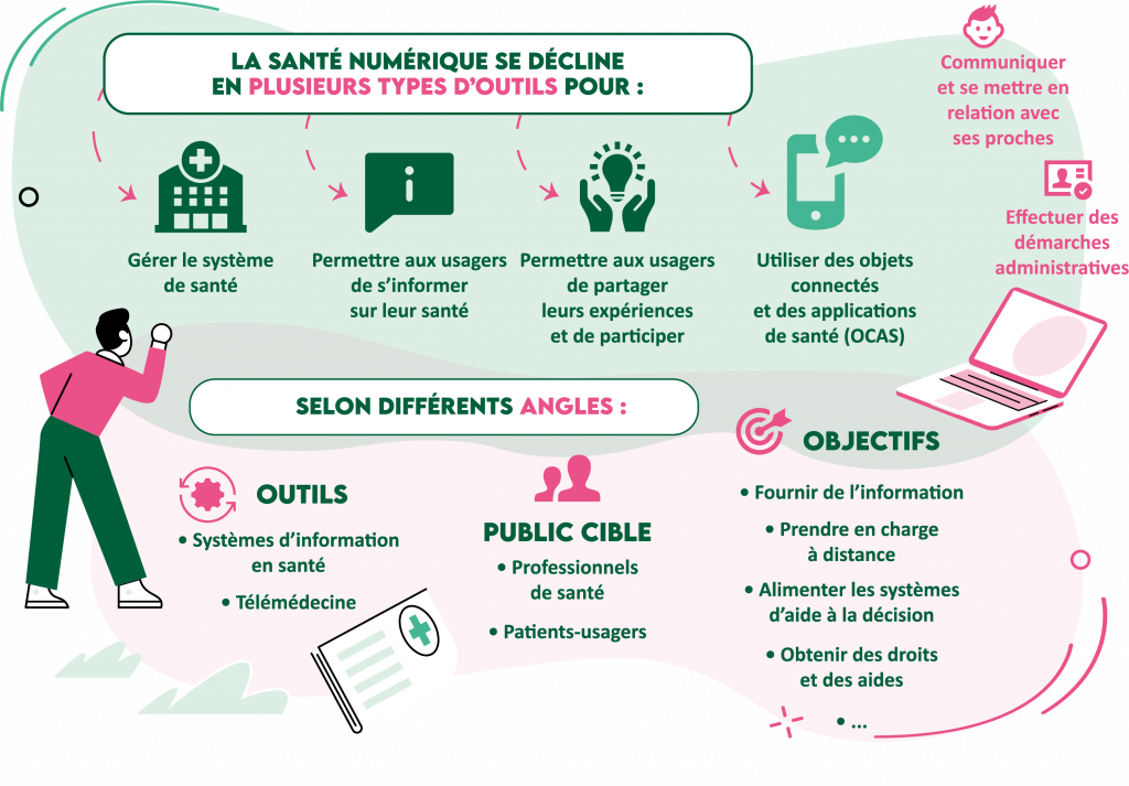 L’Organisation mondiale de la santé (OMS) définit la santé numérique (ou e-santé) comme « le domaine de connaissances et de pratiques associé au développement et à l’utilisation des technologies numériques pour améliorer la santé. […]1. Elle englobe un ensemble d’outils et de technologies mobilisés à cet effet. La santé numérique est un déterminant social de la santé à part entière ; elle conditionne, comme les autres déterminants sociaux de la santé, la façon dont une personne dispose des ressources physiques, sociales, économiques et personnelles pour satisfaire ses besoins, ses aspirations et s’adapter à son environnement2 ».